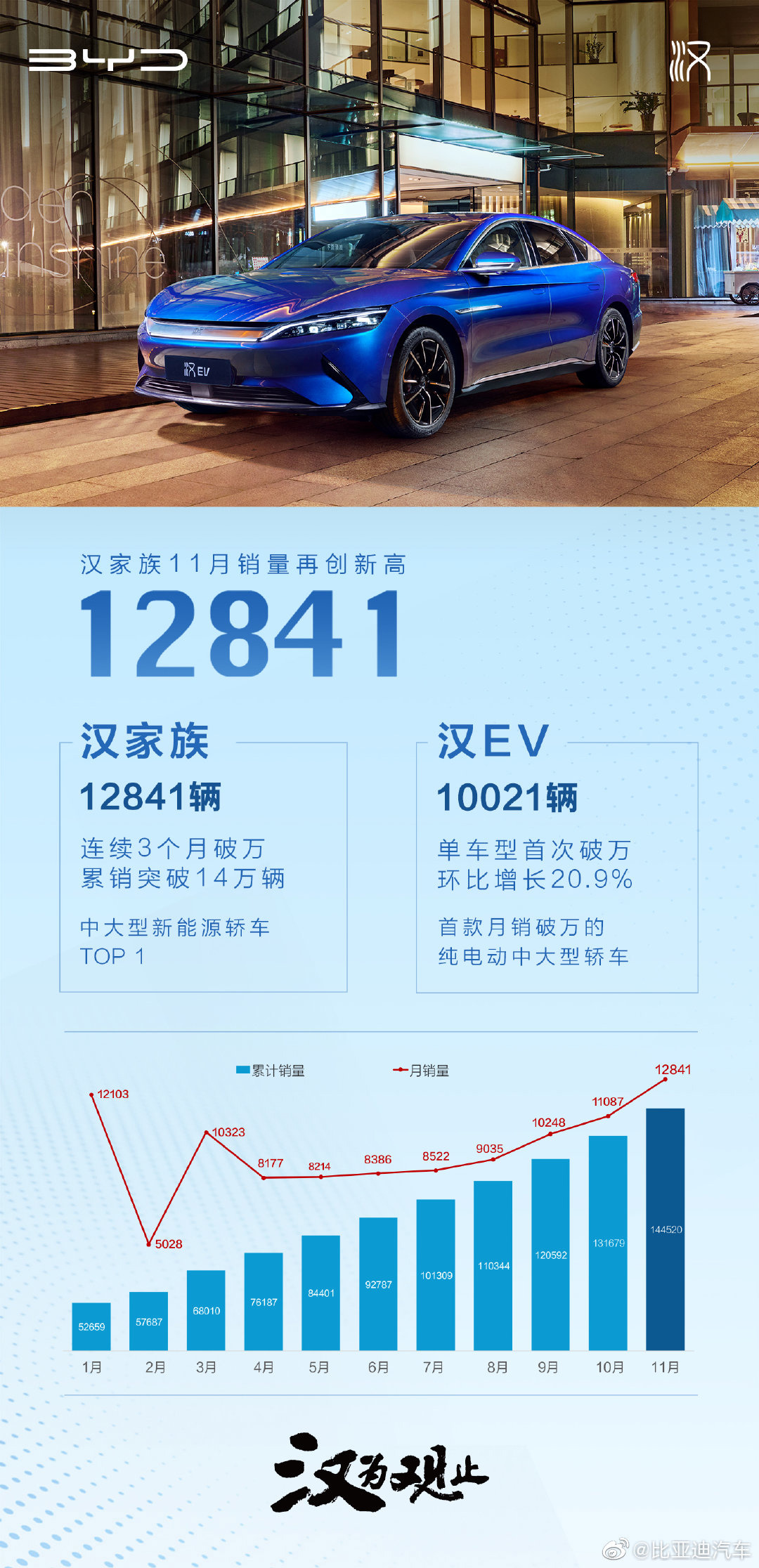 IT之家 12 月 4 日消息,今日比亚迪宣布旗下“汉”系列轿车 2021 年 11 月销售 12841 辆,连续 3 个月销量破万,连续 7 个月环比增长。其中,汉 EV 纯电动汽车月销量首次破万,环比增长 20.9%,成为首款月销破万的纯电动中大型轿车。